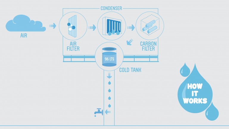 Влагозаборный рекламный щит имеет систему фильтров и емкость для накопления очищенной воды. Производительность установки составляет 96 литров в день. За время своего пребывания на Панамериканском шоссе билборд успел генерировать из воздуха 9450 литров воды.