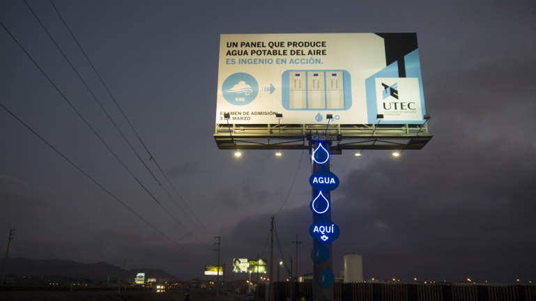 Инженерно-технический институт (UTEC) в городе Лима (Перу) объединился с рекламным агентством Mayo Publicidad для создания креативного билборда. Уникальность рекламного щита заключается в том, что он собирает влагу из пустынного воздуха, превращая ее в пригодную для питья воду.
