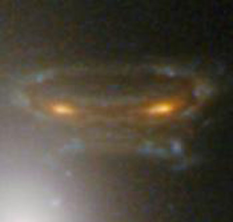 Скорее всего, именно она исказила изображение спиральной галактики, расположенной за ней.