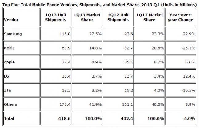 Аналитическая компания IDC в настоящее время решила поделиться данными относительно продаж мобильных телефонов в первом квартале 2013 года. По данным аналитиков IDC за предыдущие три месяца на рынок было отгружено 418,6 миллиона мобильных телефонов, против 483,2 миллиона в предыдущем квартале и 402,4 миллиона в первом квартале 2012 года.