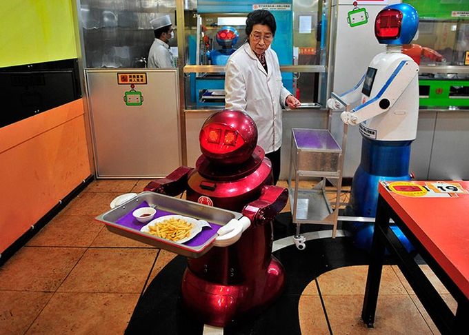В Китайской провинции Харбин уже есть практически полностью роботизированный ресторан. Принимают, обслуживают, готовят пищу и убирают здесь только роботы.