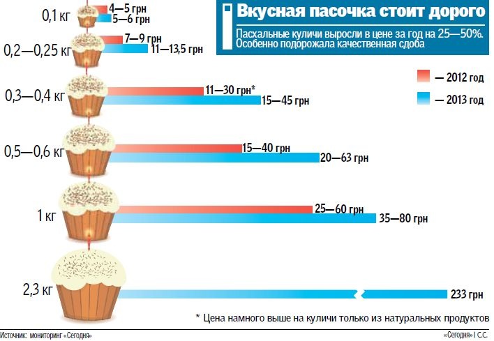 Из-за высоких цен на куличи «потяжелела» и пасхальная корзинка: две недели назад наши расчеты показывали, что набор их 4-х «пасок», двух десятков яиц, бутылки хорошего «Кагора» и по килограмму мяса, сала, огурцов и помидоров затянет в зависимости от региона, от 244 (Симферополь) до 374 грн (Киев). Это примерно на 14% (40 грн в среднем по стране) больше, чем в 2012-м. Сегодня можно сказать, что пасхи добавили к цене «кошика» 80—90 грн. Подорожало на 6—10 грн/кг (до 60—75 грн) и хорошее мясо — битки, ошеек, антрекот. Задок и лопатка стоят, как и прежде — 55—60 грн. Можно чуть сэкономить на яйцах (средняя цена 8, а не 10 грн/дес.) и овощах: свежие огурцы реально найти по 20—23 грн, помидоры по 25—28 (минус 2—7 грн). Итого на разговение потратим от 300 до 460 грн. Впрочем, по данным «Украинского клуба аграрного бизнеса», многие готовы раскошелиться больше. Так городская украинская семья планирует израсходовать на праздничный стол от 500 до 1000 грн. При этом, по словам эксперта УКАБ Тараса Гагалюка, около 60% опрошенных планируют потратить на яйца не более 30 грн, на мясо — 250 грн, на спиртное — 150 грн, на масло и сыр — до 100 грн. В селах те, у кого все свое, смогут уложиться и в 100 грн — в основном это покупка вина, бакалеи (сахар, дрожжи, масло) и сладостей.