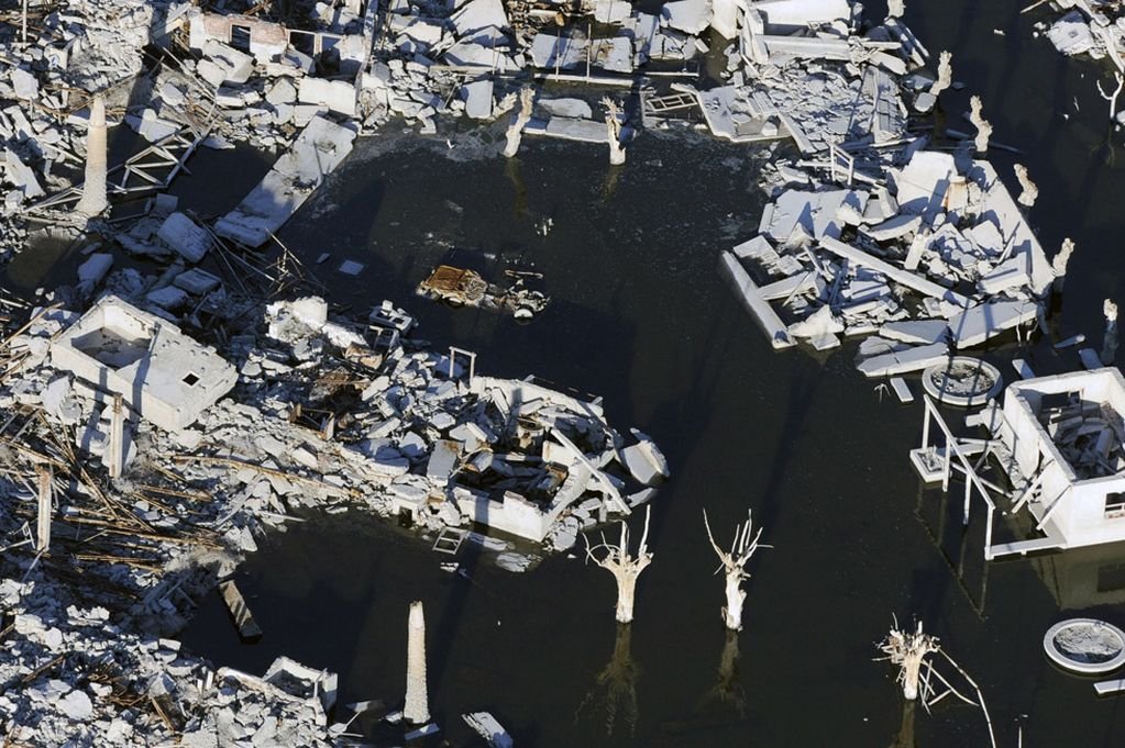 Сейчас вода отступает и открывает панораму города-призрака, с белыми от соли развалинами домов, голыми деревьями и дорогами, покрытыми илом.