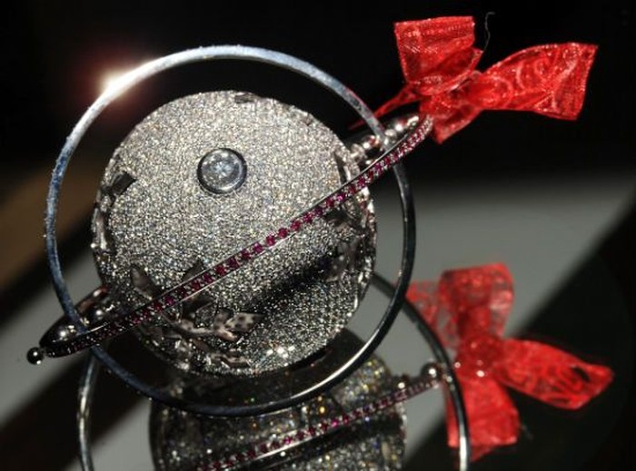 Самая дорогая елочная игрушка была создана английским ювелиром - Марк Хассисобой Она сделана из 18-каратного белого золота, усыпанный полутора тысячами бриллиантов. Он окружен двумя кольцами, инкрустированными 188 рубинами. И, в дополнение ко всему этому великолепию, шар украшен тремя алмазами по 1 карату каждый.