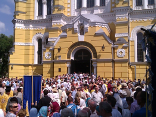 Несколько тысяч человек собралось у Владимирского собора на празднование 1025-летия крещения Киевской Руси. В настоящее время в соборе завершается праздничная служба. Вход в собор свободный.