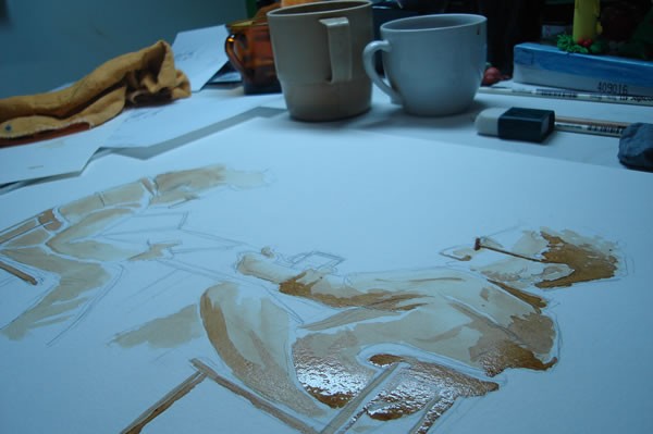 Сначала раскладывает на столе рабочий инвентарь. Вместо палитры - чашки. Вместо красок - растворимый кофе.