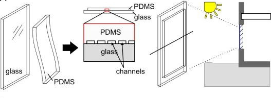 Ученые разработали лист прозрачного гибкого полимера с «охлаждающим слоем» из силикона, пронизанного крошечным каналами с высотой поперечного сечения 1-2 мм и шириной 100 мкм, по которым циркулирует вода комнатной температуры со скоростью 2 мл в минуту. После нагрева опытного образца окна размером 10 х 10 см инфракрасная камера зафиксировала уменьшение температуры стекла на 7-9 градусов Цельсия. Вода забрала тепло у нагретого стекла и отвела его за счет циркуляционной системы. Зимой происходит обратный процесс: вода комнатной температуры отдает тепло стеклу. Все это позволяет повысить энергетическую эффективность зданий.