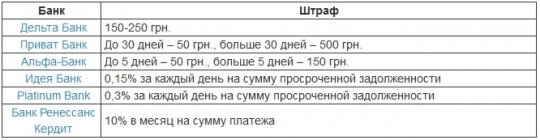 Но не один Дельта Банк устанавливает фиксированные штрафы без учета суммы и срока платежа. Так, в ПриватБанке пеня за просрочку по кредитной карте составляет 50 грн. Если заемщик не платит 30 дней, штраф взлетает до 500 грн. В Альфа-Банке задержка платежа на 5 дней будет стоить клиенту 50 грн. Если задолженность не погашена на пятый день, штраф составит уже 150 грн. Другие банки, активно выдающие кредиты наличными либо кредитные карты, насчитывают пеню в размере 1-10% от суммы задолженности за каждый день просрочки. Подробнее о комиссиях банков смотрите в таблице: «Какие штрафы применяют банки за просрочку платежа».
