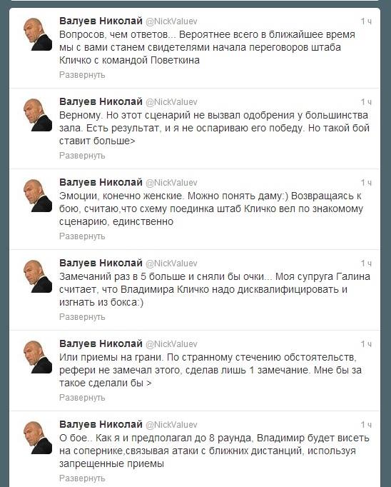 «Замечаний раз в пять больше и сняли бы очки (чтобы это изменило? учитывая, что Кличко, уже во втором раунде устроил Поветкину нокдаун — прим. «Хвилі»)», — написал Валуев, добавив, что «моя супруга Галина считает, что Кличко нужно дисквалифицировать и изгнать из бокса».