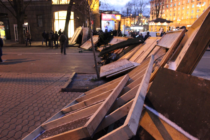 Как сообщалось ранее, в Киеве евромайдановцы возвели вокруг Майдана Незалежности баррикады. Для этого активисты, в частности, использовали часть конструкций разобранной новогодней елки и железные щиты.