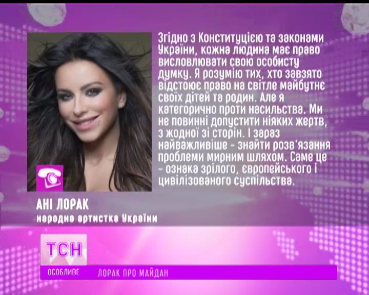 "В соответствии с Конституцией и законами Украины, каждый человек имеет право высказывать свое личное мнение. Я понимаю тех, кто рьяно отстаивает право на светлое будущее своих детей и семей. Но я категорически против насилия. Мы не должны допустить никаких жертв, ни с одной из сторон. И сейчас самое важное - найти решение проблемы мирным путем. Именно это - признак зрелого, европейского и цивилизованного общества", - говорится в заявлении Ани Лорак.