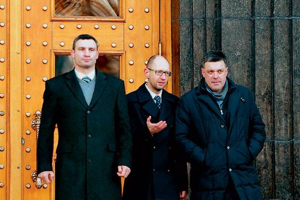 На Майдан, после закрытия сессии Верховной Рады Украины прибыли лидеры оппозиции - Виталий Кличко, Олег Тягнибок и Ярсений Яценюк, а также Петр Порошенко.