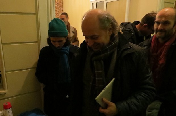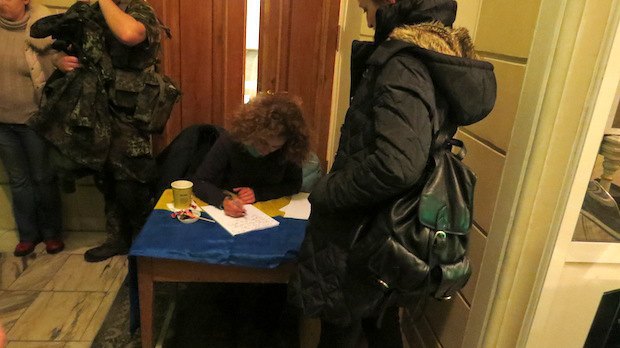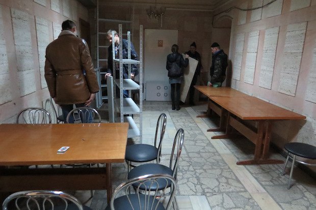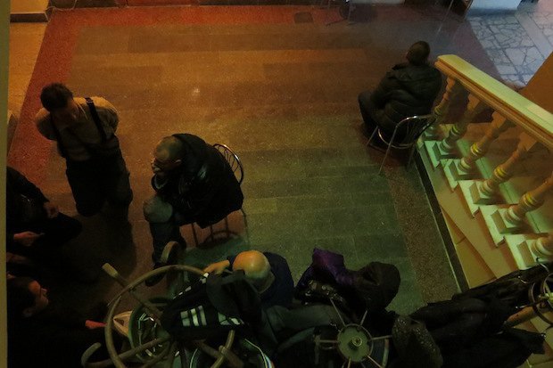 Активисты расположилились в подвале, а проход на верхние этажи забаррикадировали - ждут сотрудников Минкульта, чтобы те приняли участие в описи. Здание охраняют отряды самообороны.