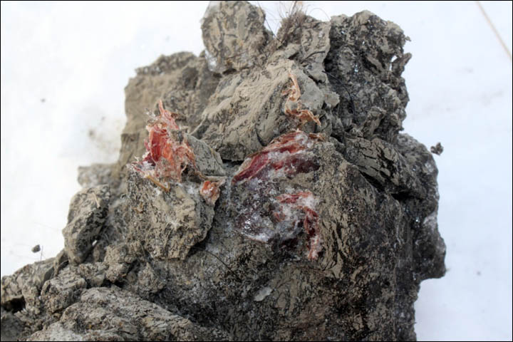 «Верхняя часть туши была съедена животными, однако нижняя часть, лапы и, что еще более удивительно — брюшная часть, сохранились очень хорошо. Не пострадала и печень — она находится в очень хорошем состоянии и похоже внутри нее имеются какие-то твердые фрагменты. Изучить нам их пока не удалось, но похоже это печеночные камни».
