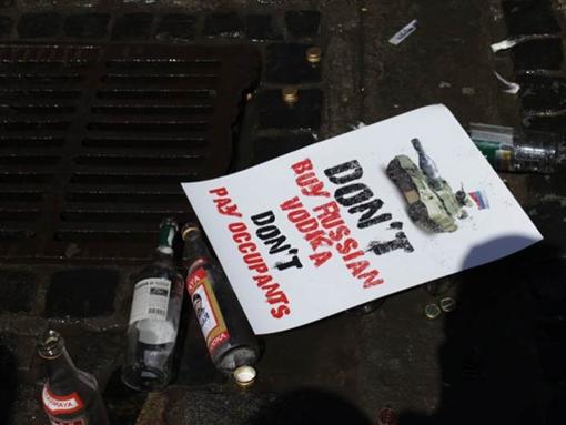 В понедельник в центре Львова местные активисты организовали флеш-моб, целью которого являлось снизить в городе популярность российских производителей алкоголя. Активисты вылили в канализацию десяток бутылок русской водки. Парни и девушки держали в руках плакаты с призывами не покупать российский алкоголь на украинском и английском языках.