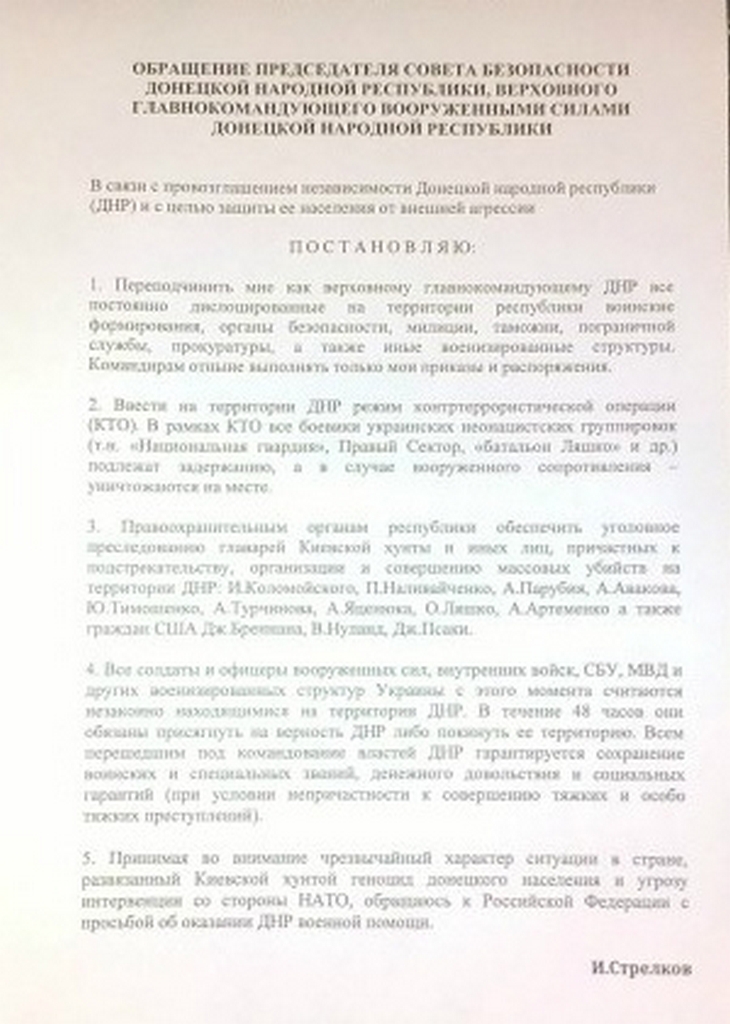 Последним пунктом в документе числится обращение к России с просьбой оказать военную помощь в связи с якобы угрозой интервенции со стороны НАТО.