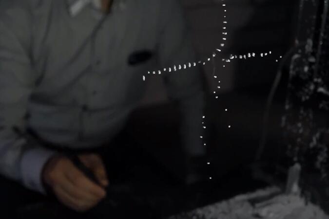 Частички подымаются в воздух силой акустических колебаний. Точность управления составляет полмиллиметра, а расположены они в пространстве с интервалом 4,25 миллиметра.