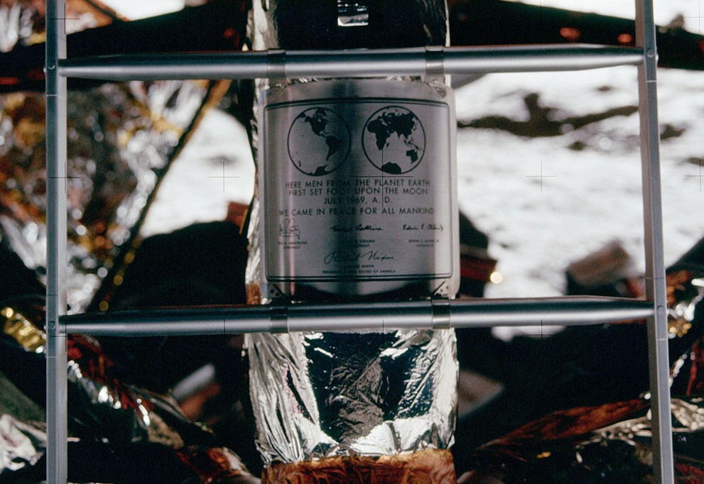 18. Мемориальная капсула гласит: “Здесь люди с планеты Земля, впервые ступившие на Луну, июль 1969 года н.э. Мы пришли с миром для всего человечества”