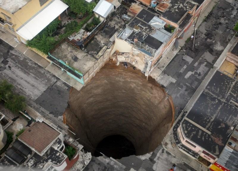 В столице Гватемалы на самом деле не один, а два гигантских «колодца». Первый образовался в 2007 году из-за разрушившейся канализации под городской улицей, погубив двух человек и приведя к эвакуации тысячи жителей. Он представляет собой почти идеальный круг и имеет солидную глубину. Три года спустя другой провал глубиной 60 метров и шириной 18 «съел» трехэтажное здание в городе. Хоть впадина и развивалась постепенно, непрерывный дождь ускорил процесс. Благо, на этот раз никто не погиб.