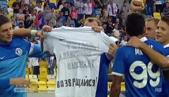 Празднуя забитый Евгением Коноплянкой гол на 64-й минуте матча, игроки продемонстрировали футболку с надписью: