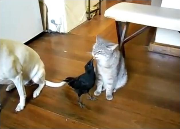 Так вот одна из хозяек обучила прирученную ворону кормить своих четвероногих домашних любимцев. Среди них оказались кошка и собака.