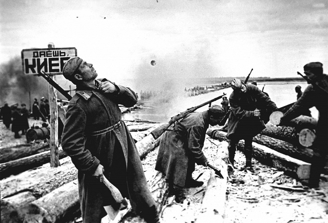 В конце сентября 1943 года войска Воронежского фронта (позже переименован в 1-й Украинский фронт) захватили плацдармы на правом берегу Днепра к северу и югу от Киева и дважды пытались освободить город. На фото: советские саперы наводят переправу через Днепр, 1943 год