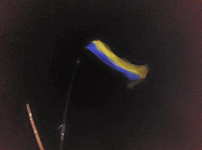 «Этот флаг был вывешен над Саур-Могилой, ставшей братской для десятков, если не сотен, украинских воинов. Так местные патриоты напомнили оккупантам чья эта земля. Украинское знамя провисело до утра. Пока террористы не заметили символику», — сообщает украинский репортер.