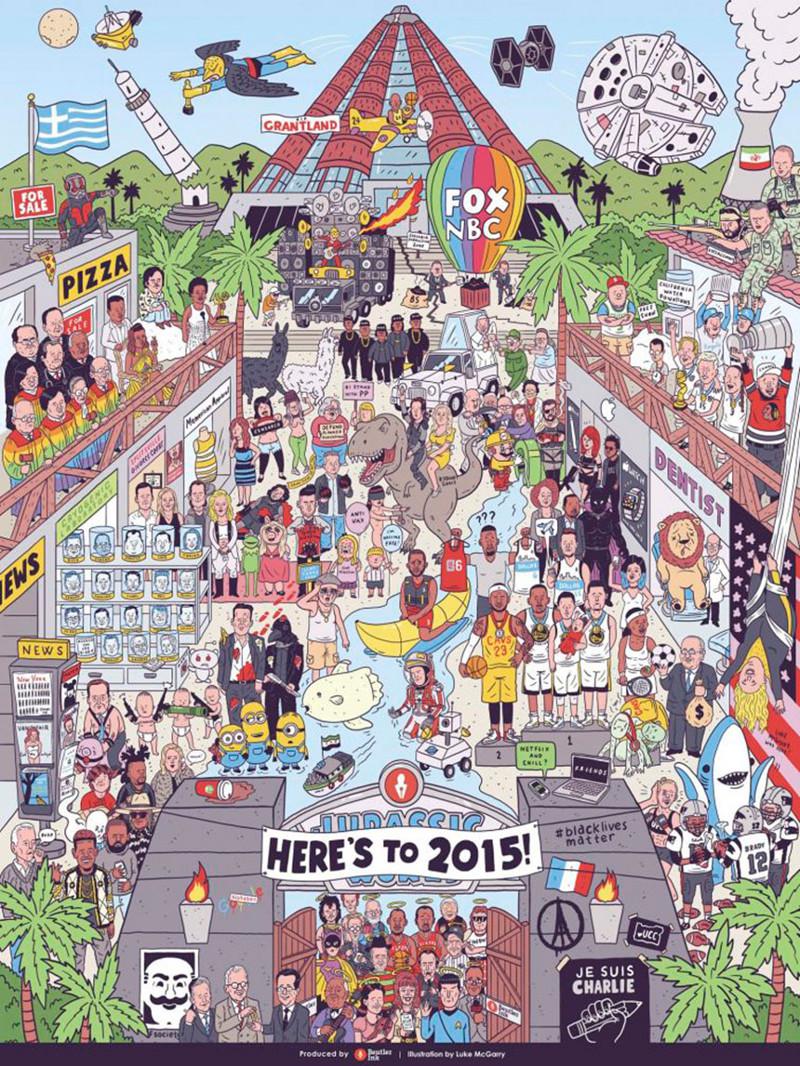 В иллюстрацию попали отсылки к терактам в Париже, войне в Сирии, смерти льва Сесила, выход 7-го эпизода «Звездных войн», «Мира Юрского периода» и многое, многое другое.