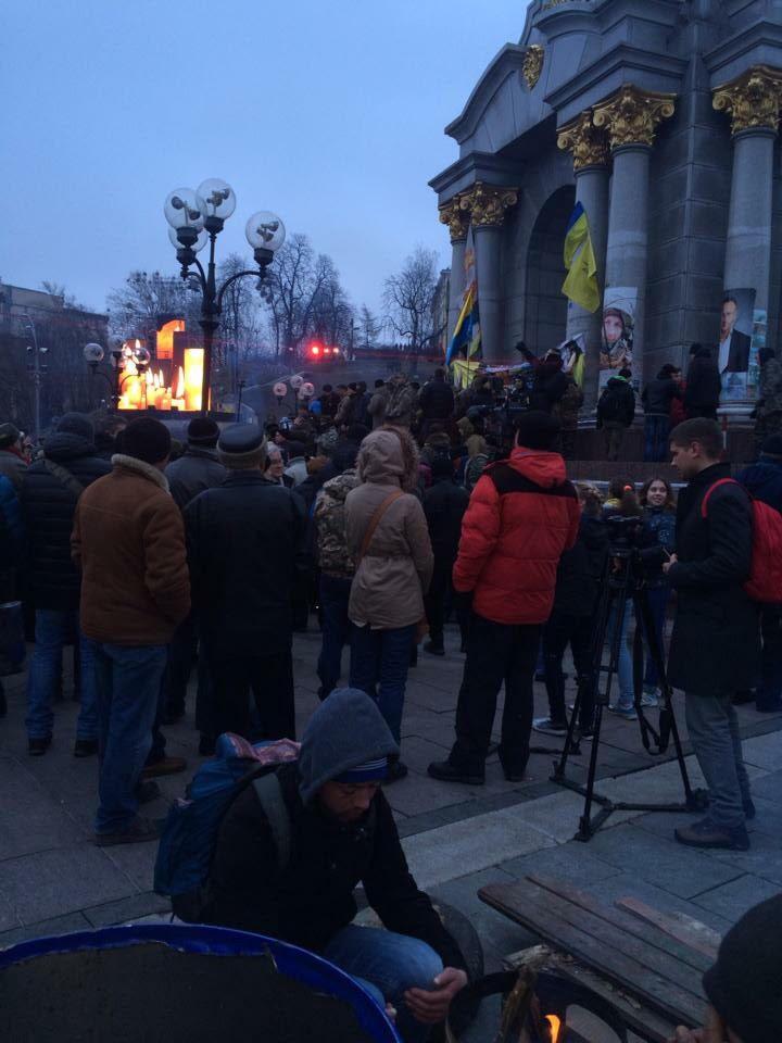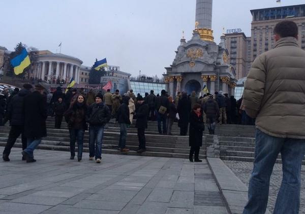 К этому времени там собралось не более 500 человек. В основном это пенсионеры, студенты-зеваки, которые просто посмотреть что происходит. Немало людей в камуфляже, военных. По их разговорам можно понять, что они пришли сюда проследить, чтоб "ничего не случилось". Полноценной сцены нет (утром полиция не дала завезти аппаратуру). Поэтому со звуком большие проблемы.