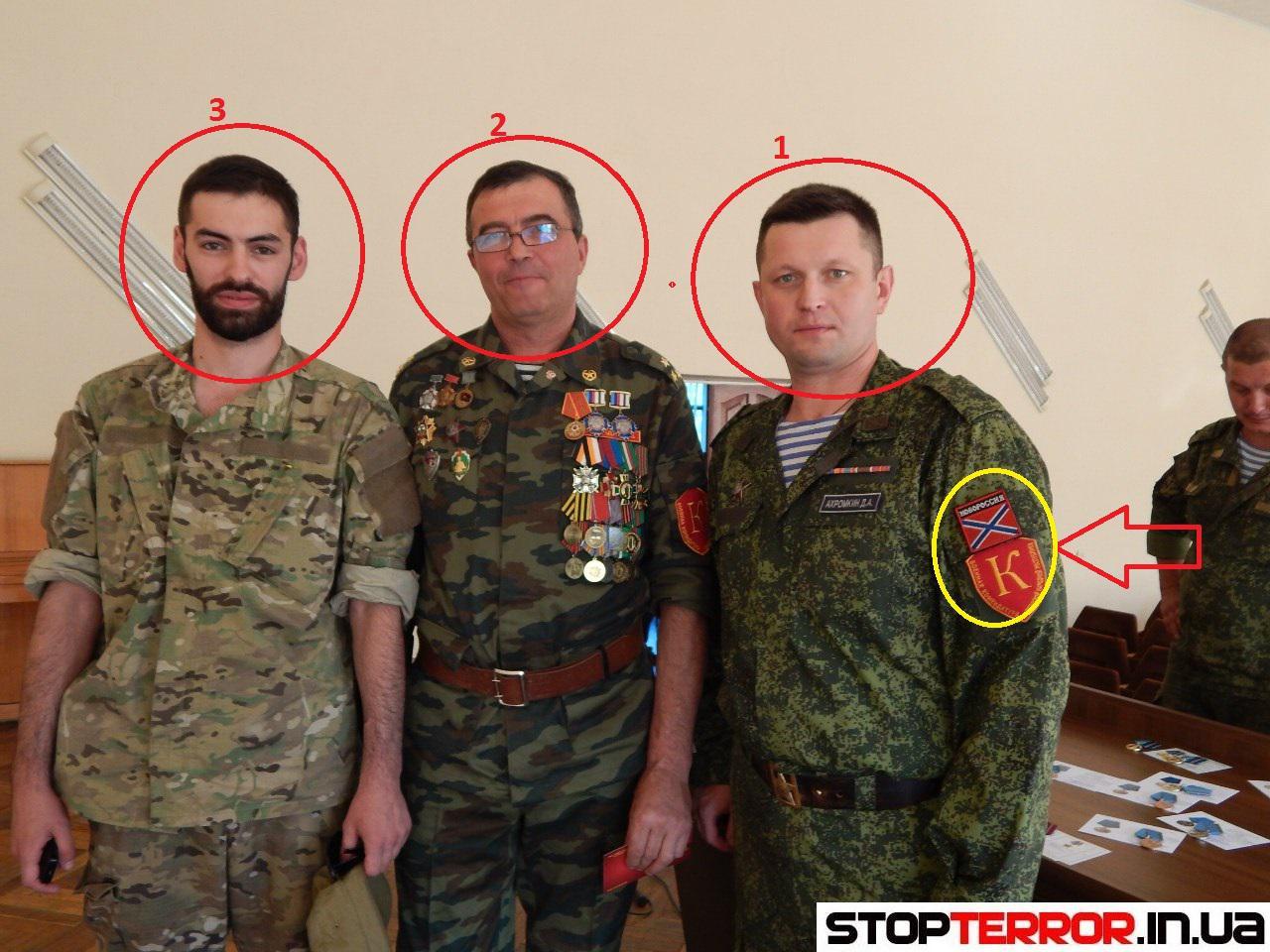 Кроме того, у него заметили также фото с боевиками, которые занимают командные должности в «республиках». В частности, есть у него снимки с Михаилом Толстых с позывным «Гиви» (на фото 1), Арсением Павловым, известным как «Моторола» (на втором фото под номером 1, Ахромкин - 2), и главным комендантом «ЛНР» Сергеем Грачевым с прозвищем «Грач» (на третьем фото под номером 2, Ахромкин - 1).