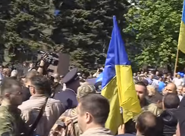 Активисты в камуфляжной форме перегородили дорогу колонне, который организовал «Оппозиционный блок». Шествие возглавил один из лидеров «Оппоблока» Александр Вилкул. Рядом с ним находился нардеп Дмитрий Колесников. Политики держали в руках фотографии своих родственников-участников Великой Отечественной войны.