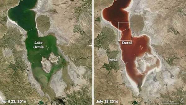 Летом уровень воды в Урмии падает, в результате чего в нем повышается концентрация соли. Однако гидробиологи утверждают, что озеро получает свой красный цвет из-за растущих в озере одноклеточных водорослей под названием дуналиелла.