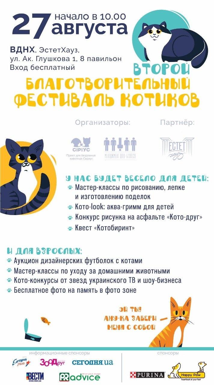 Гости фестиваля смогут не только посмотреть на 50 котиков и выбрать себе питомца, но также принять участие в различных конкурсах и мастер-классах.