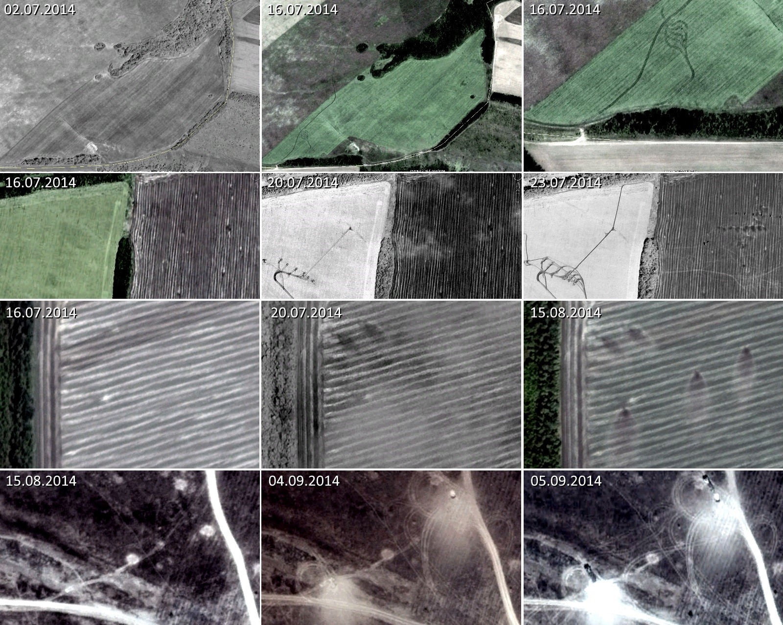 Во втором ряду представлена территория, на которой находятся как минимум три вероятные огневые позиции. Летом 2014 года Штаб верховного главного командования ОВС НАТО в Европе представил спутниковые снимки от 23 июля 2014 года в качестве подтверждения того, что Россия наносила артиллерийские удары через границу. На снимках этого района от 20 июля 2014 год на огневых позициях уже заметны шесть самоходных артиллерийских установок. На снимках от 23 июля 2014 года cнова видны шесть самоходных артиллерийских установок. При этом к югу от установок также заметны две пересекающиеся линии с отметками, свидетельствующими о ведении огня.