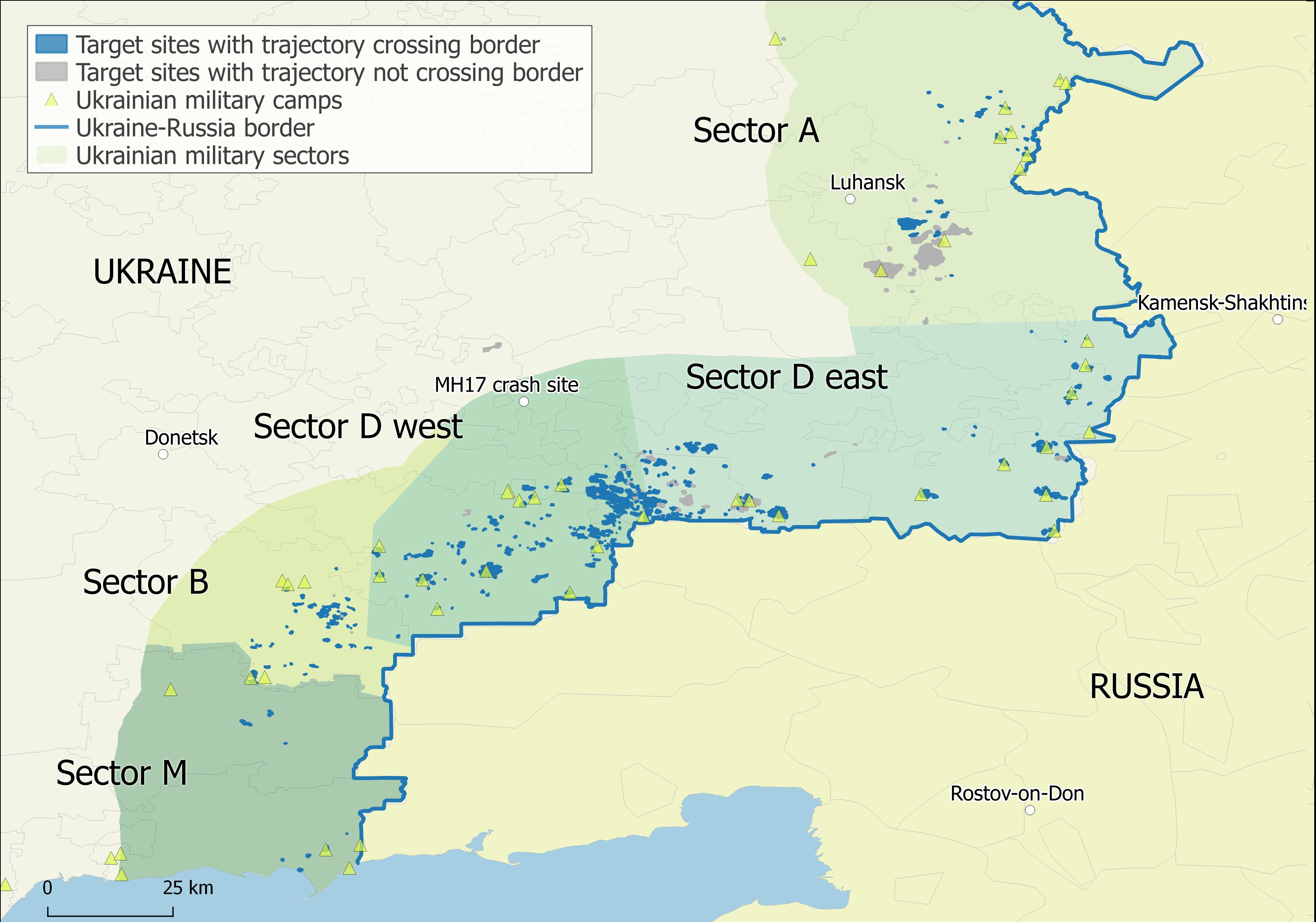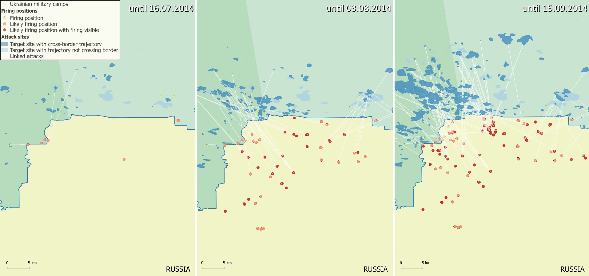 Места обстрелов на территории Украины оценивались по масштабу обстрела (10 и менее воронок — небольшой, 10-100 воронок — средний, >100 воронок — крупный), дате появления на спутниковых снимках и траектории снарядов. Траектория оценивалась по методике, используемой США в полевых исследованиях. Эта методика сходна с использовавшейся в предыдущих докладах Bellingcat, в научном докладе и в экспертном заключении в суде над Надеждой Савченко. Ограничения по времени не позволили установить траектории снарядов по каждой из тысяч воронок на 518 местах обстрелов. Таким образом, для определения общего азимута траектории для настоящего доклада на каждом месте обстрела выбиралось по 5 воронок, после чего давалась оценка траектории на основе этой выборки.