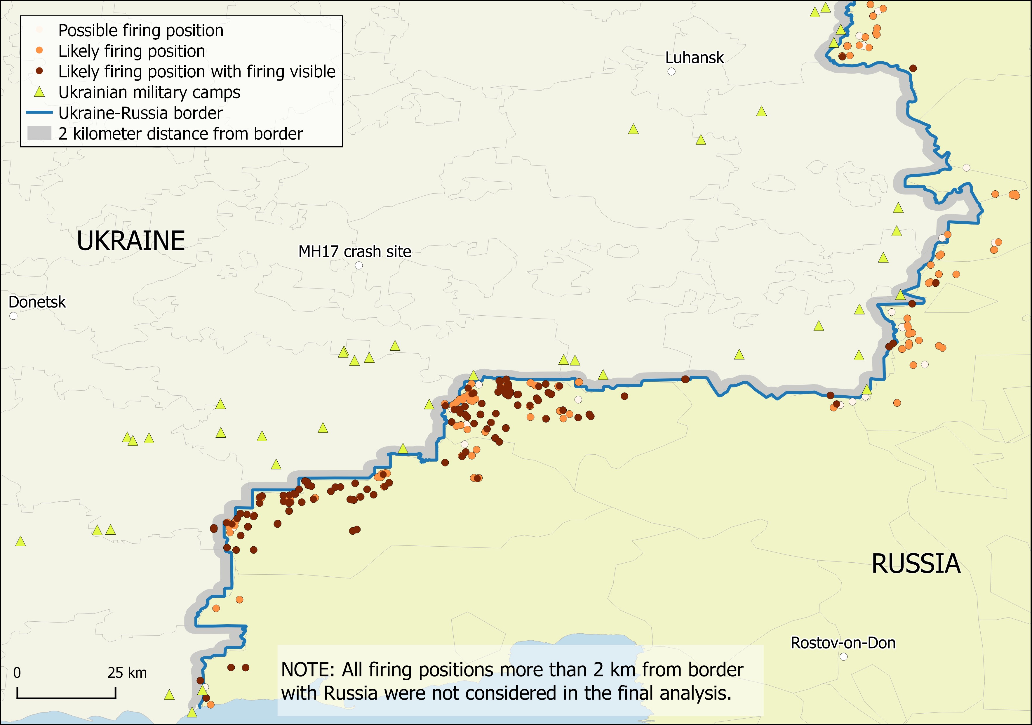 Мы изучили приграничную полосу на территории Украины шириной в 22 километра в Донецкой области и в Луганской области до села Нижняя Ольховая. На территории России мы изучили всю территорию Ростовской области через границу от местности, изученной в Украине. Мы искали места обстрелов и огневые позиции вручную, в основном при помощи Google Earth. Поиск повторялся для спутниковых снимков различной датировки. Мы обнаружили и изучили 2 254 возможных объекта на территории России и Украины. 518 объектов представляли собой поля воронок от артобстрелов на территории Украины, тогда как 305 были определены как потенциальные огневые позиции на территории России или внутри Украины в непосредственной близости от границы. Следует отметить, что под 305 потенциальными огневыми позициями понимается общее число потенциальных артиллерийских ударов.