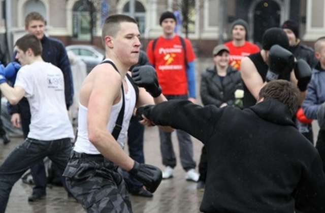 Молодые люди бежали по центру Донецка, скандируя "8 марта - не повод бухать" и другие речовки. Несмотря на дождь, на центральной площади мужчины отжимались, приседали, перетягивали канат, шли стенка на стенку, а также боксировали.