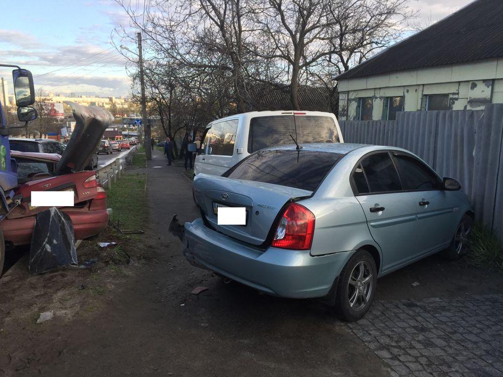 После мощного удара автомобиль "Хюндай Акцент" продолжил неуправляемое движение и столкнулся со стоящим автомобилем "Фольксваген Транспортер" и препятствием (забор домовладения).