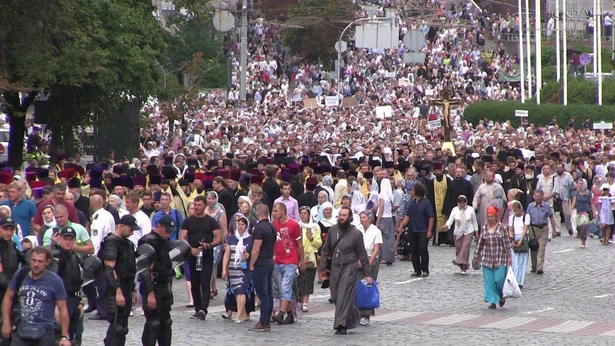 На Европейской площади около Украинского дома в четверг собрались тысячи верующих прихожан из разных епархий со всей страны. Сама площадь была оцеплена полицией, людей пропускали через металлоискатели, кроме того, полиция шла по ходу крестного хода с обеих сторон.