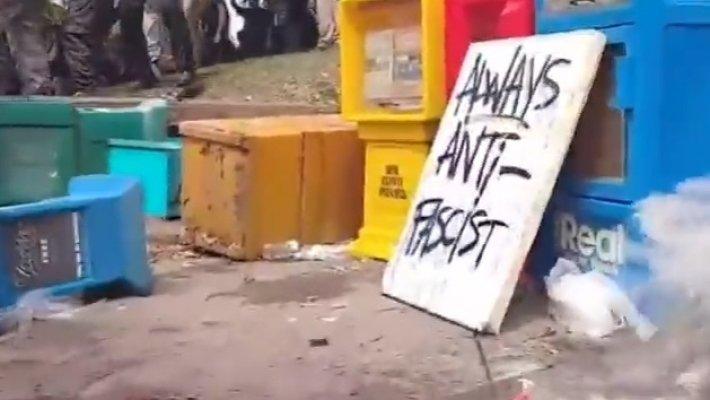 На фотографиях видно, что легковушка въехала в толпу людей, которые участвовали в акции протеста. Все они держали в руках красные флаги.