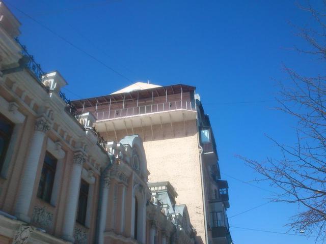 "Глыба упала с мансарды-балкона, которую пристроили к соседнему зданию. Когда узнали, что пробита крыша, мы вызвали спасателей, милицию. Составили акт, милиционеры написали заявление. Наши сотрудники ликвидировали глыбу, сами ее расчистили и вынесли на улицу. Сообщили в управление культуры КГГА и местный ЖЭК № 107. Я пробовала узнать, кому пристройка принадлежит и имели ли право на ее строительство, но никто ничего не знает. В ЖЭКе, который обслуживает район, говорят что пристройка незаконная, но ничего сделать не могут, потому что это частная собственность. Хуже всего то, что на мансарде видна еще одна глыба снега и она в любой момент может упасть на нашу крышу. Спасатели не могут ее сбить, потому что нет такой лестницы у них ", - говорит директор музея Наталья Терехова.