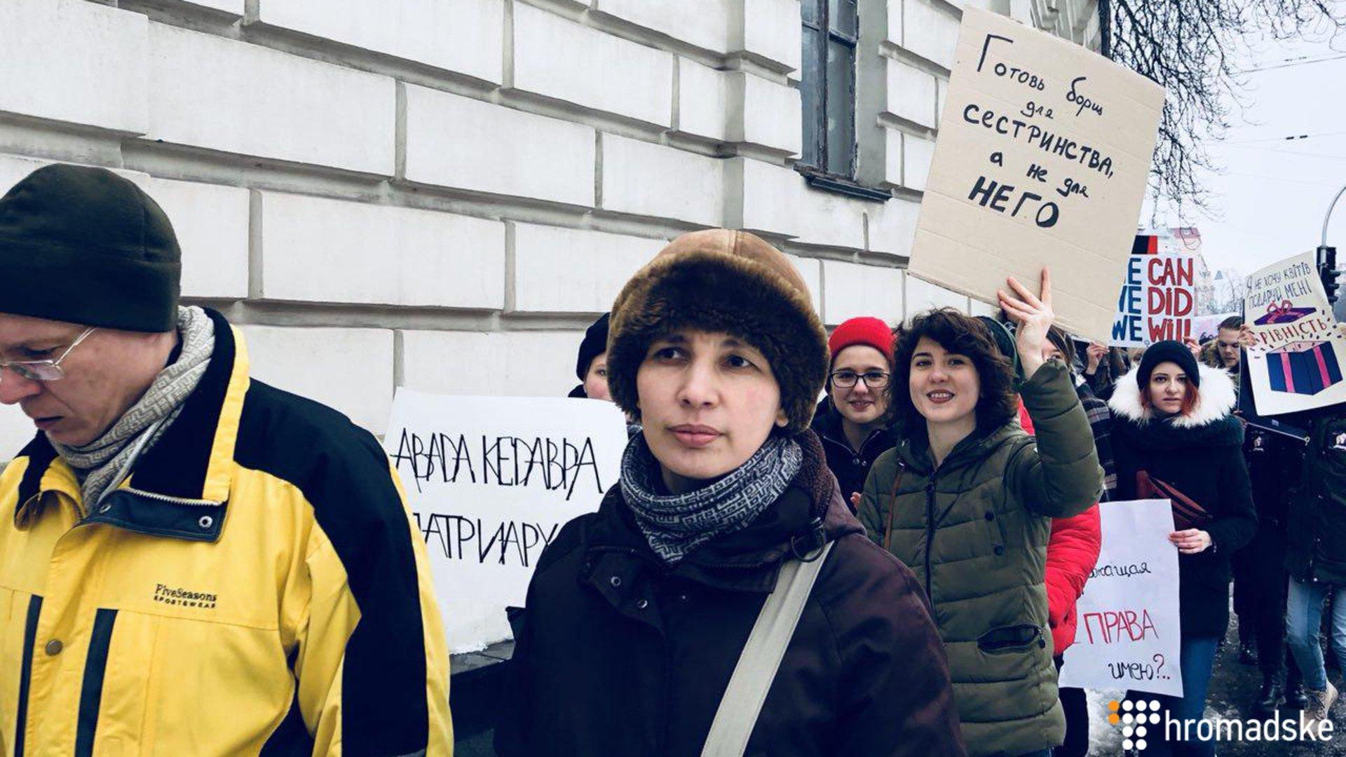 Отдельно отмечается, что около Михайловского собора собрались борющиеся с проявлениями современного феминизма.