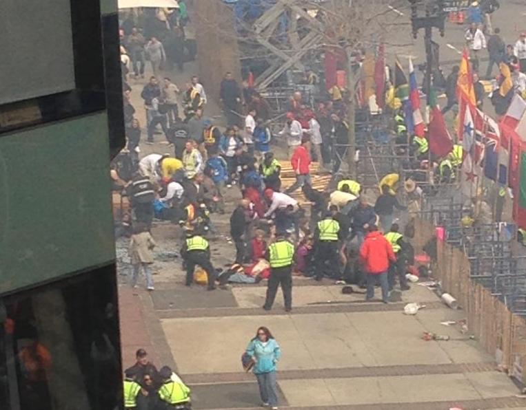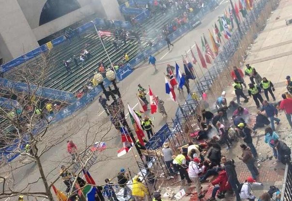 На северной стороне Бойлстон-стрит прогремел сильный взрыв перед мостом, за которым расположен финиш. Через несколько секунд прозвучал еще один взрыв.