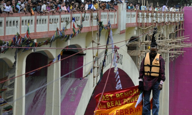 Сайлендра Нат Рой, неоднократно занесенный в Книгу рекордов Гиннеса, накануне пытался пересечь реку в штате Западная Бенгалия по канату.