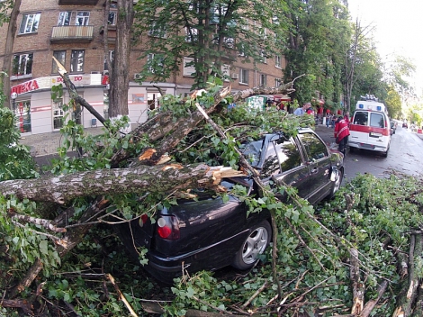 Как сообщал НБН, в воскресенье, 26 мая, в Соломенском районе Киеве на ул. Островского шквальными порывами ветра повалило дерево, которое разбило легковой автомобиль Peugeot 407.