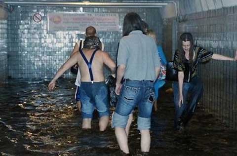 Лужи во многих районах города достигают глубины выше колена и затапливают подземные переходы.