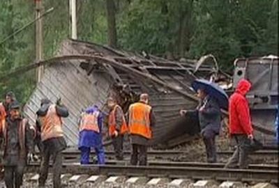 Скорость поезда была не очень большой, но этого оказалось достаточно. Место аварии выглядит как после партизанской диверсии: разрушенная колея и разбитые вагоны.