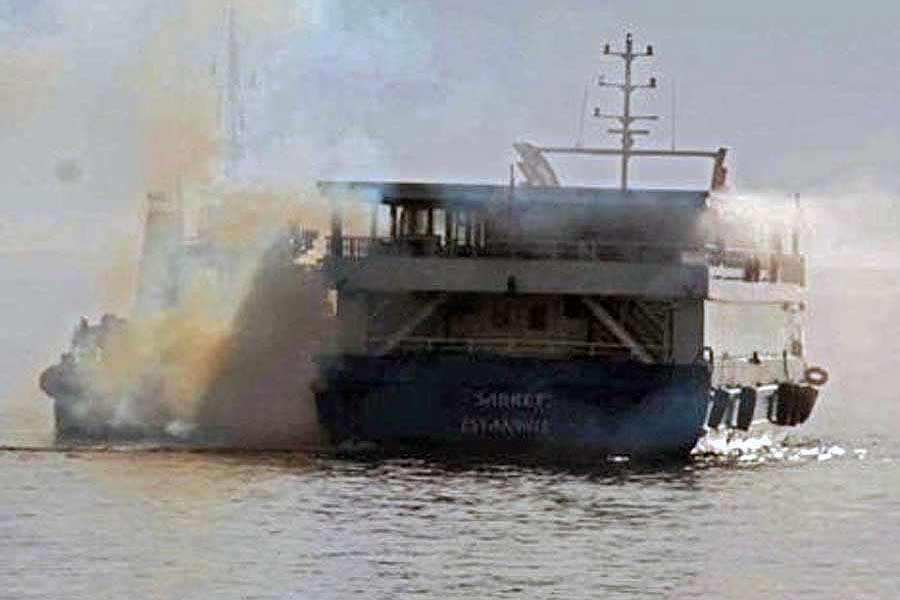 В готовности к тушению пожара находится пять судов (три Черноморского флота и два спасательных судна порта).