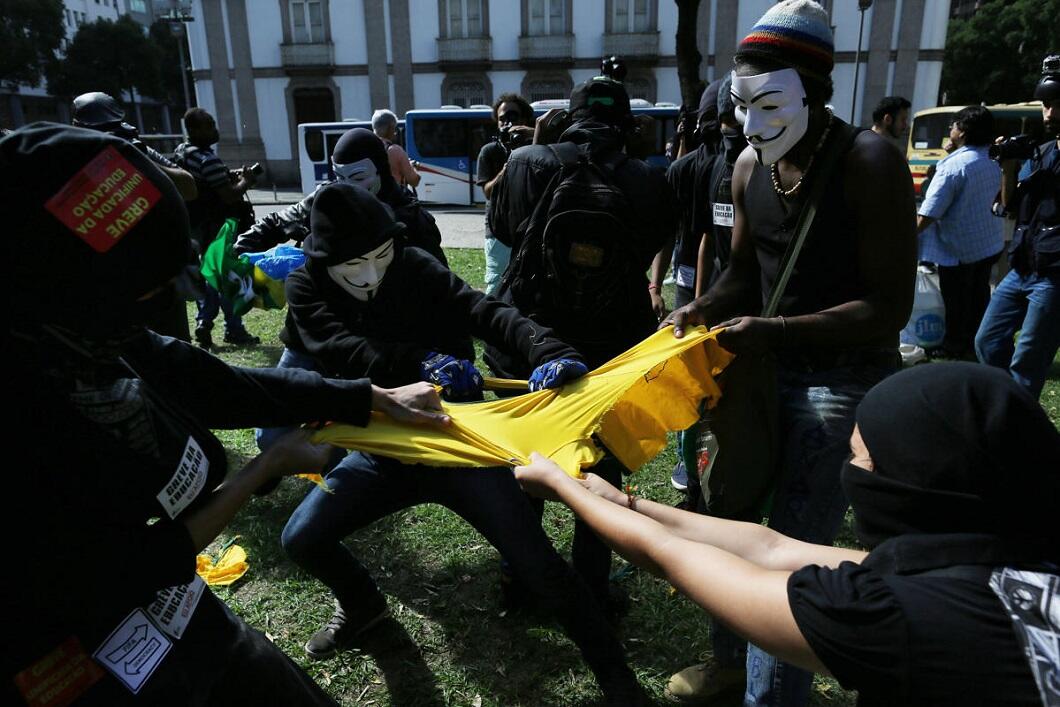 5. Протестующие в масках разрывают футболку бразильской национальной футбольной команды во время демонстрации в центре Рио-де-Жанейро, четверг 12 июня 2014. (© AP Photo / Лев Корреа)