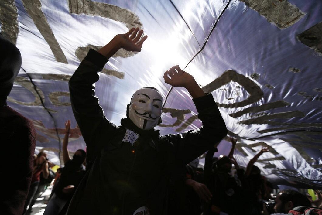 6. Антиправительственный демонстрант в маске идет под гигантским баннером во время акции протеста против ЧМ по футболу 2014 в Рио-де-Жанейро, 12 июня 2014. (© REUTERS)